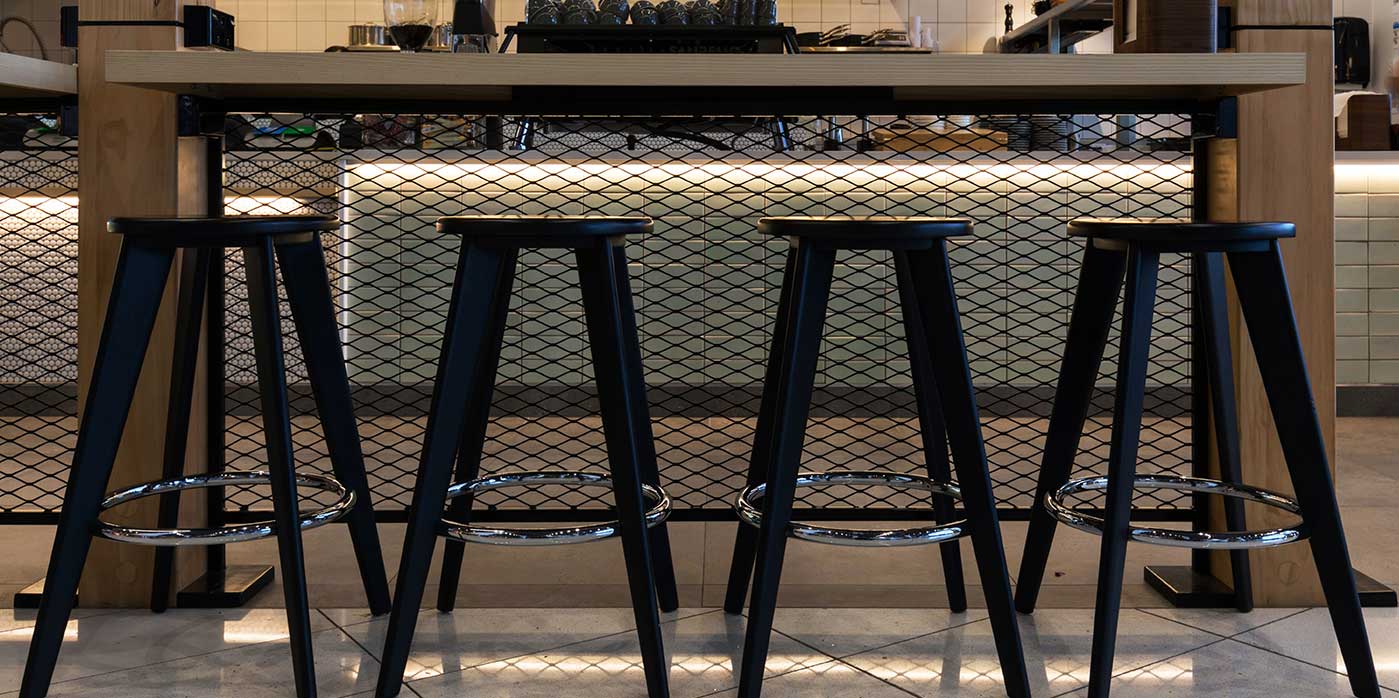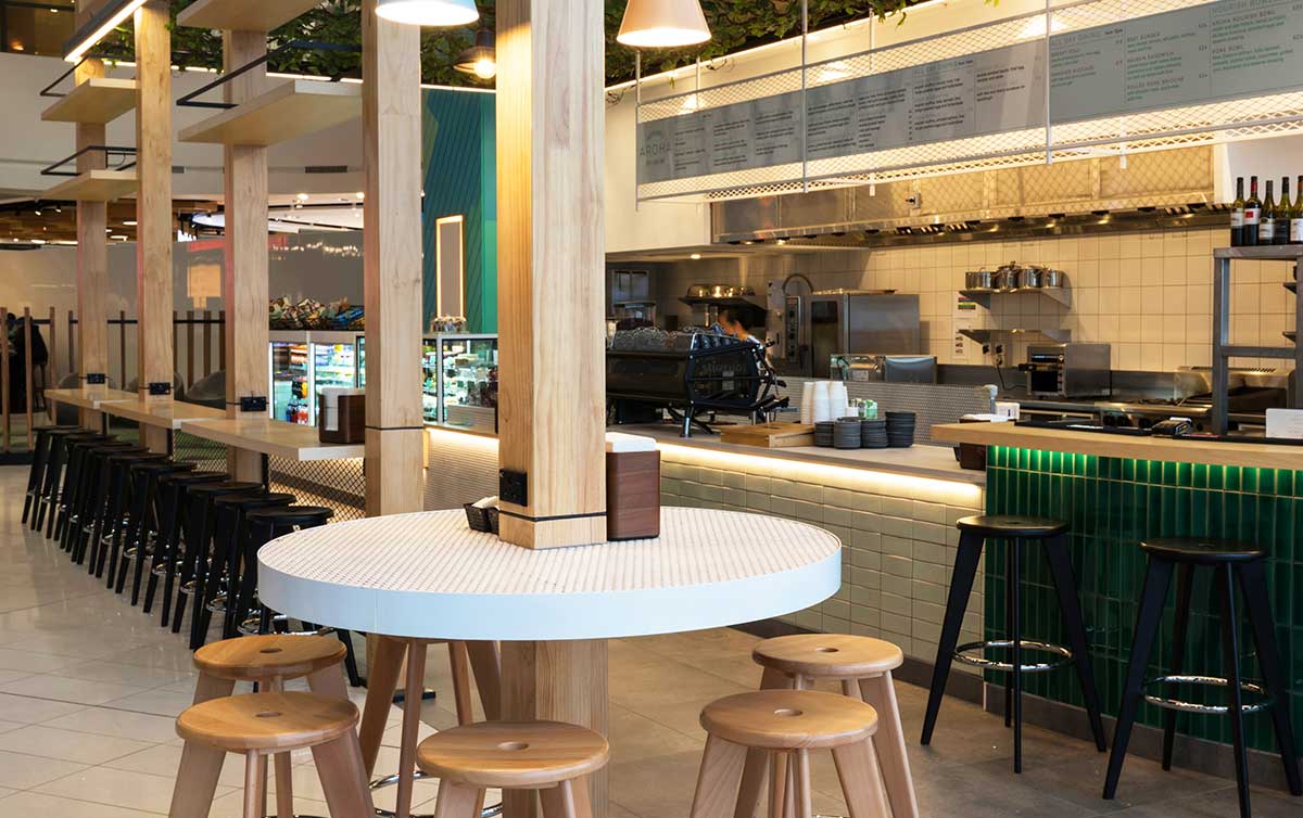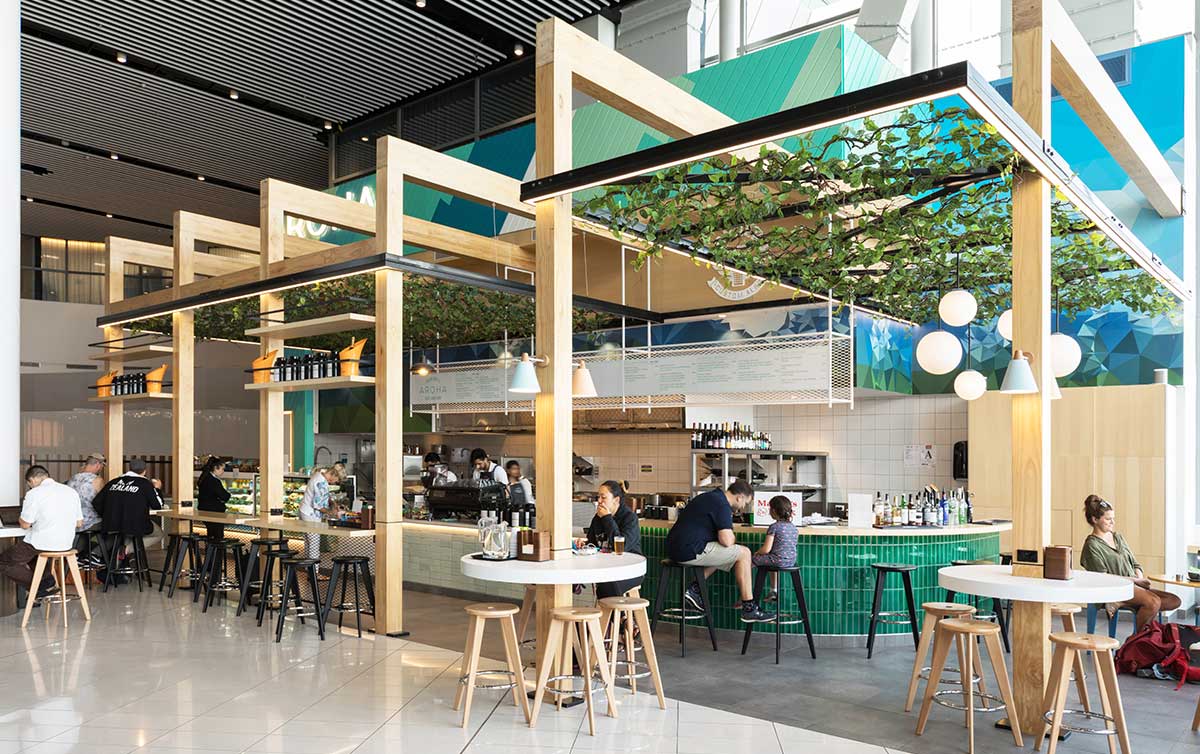 With a 9 meter high base build ceiling, the key design feature consisted of a portal at 6.3 m high clad in aqua hue patterned panels, with timber arches extending out over the tenancy and into the neighbouring food court area, a nod back to tree canopies in New Zealand’s national parks. The colour palette was developed of layers of blue and green, referencing back to the land, sea and sky with touches of urban materials of mesh and concrete look flooring to balance out.