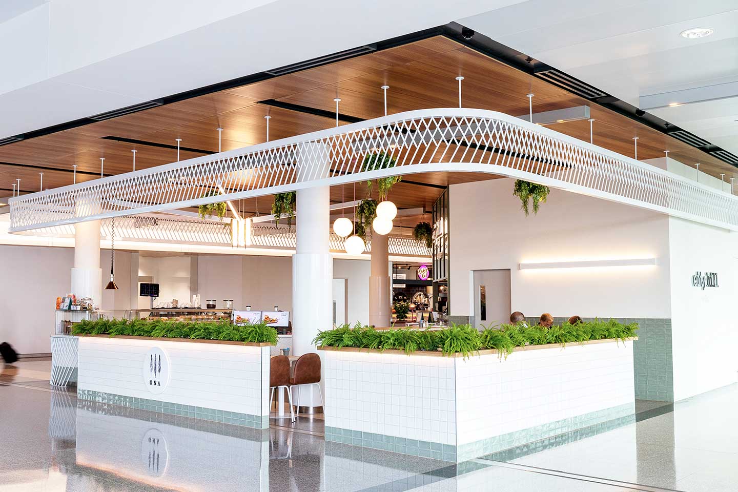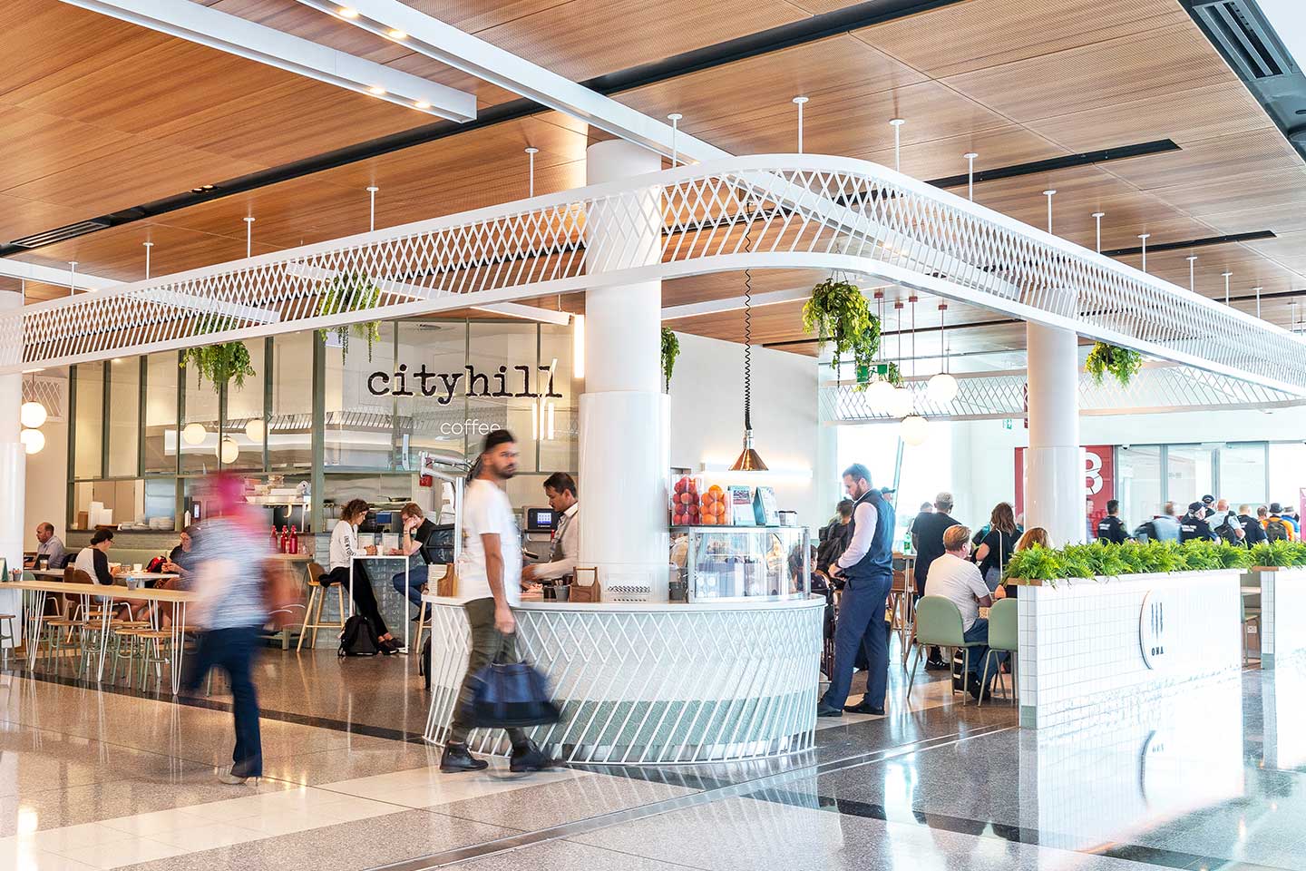 The brief from ARE was to design a café with a full working kitchen and separate coffee counter that provided a light and airy design to work with the interior aesthetics of the Airport, the design also had to connect back to its locality – Canberra.