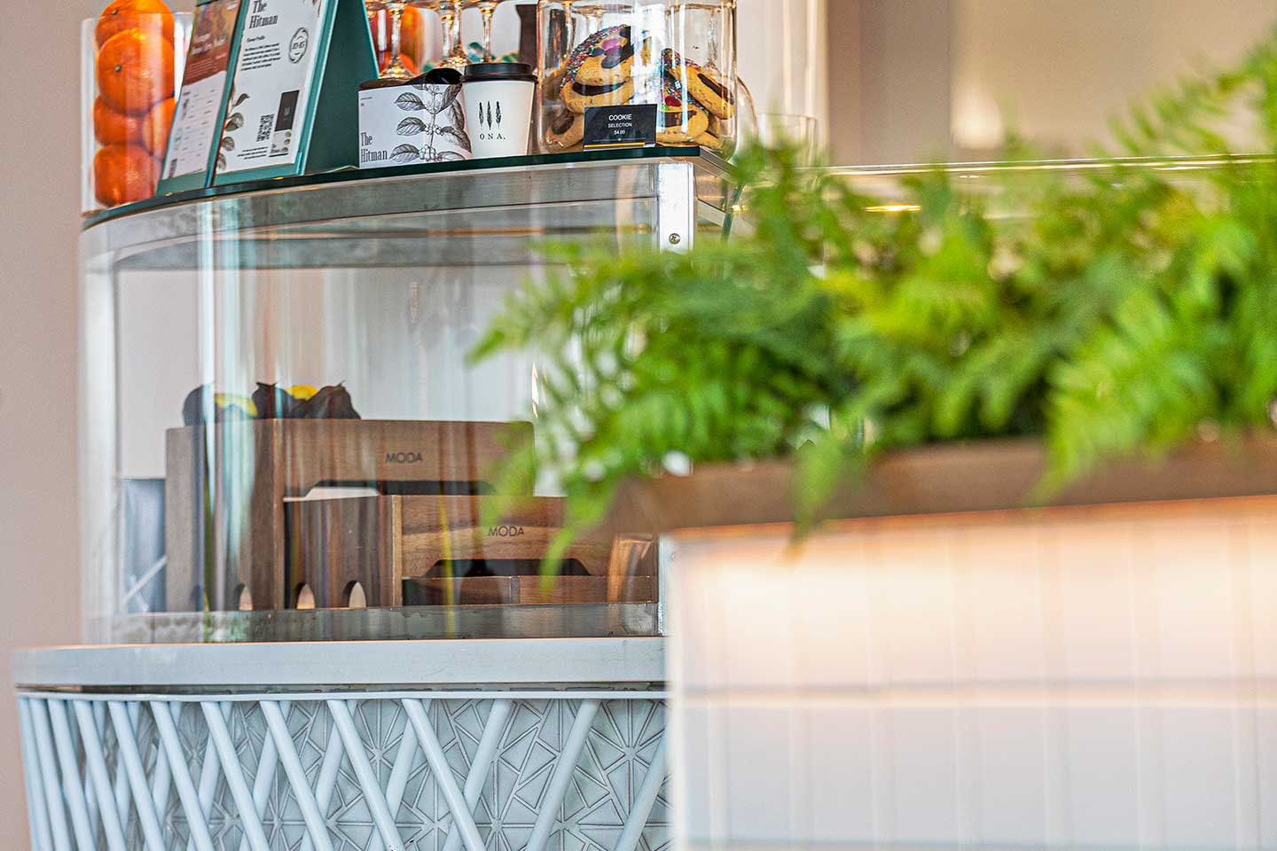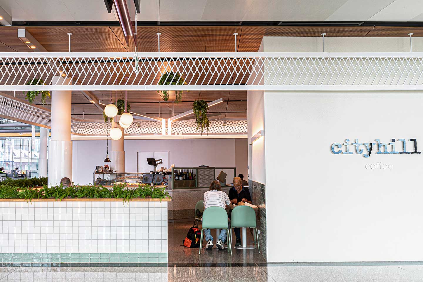 A soft colour scheme of moss green, warm white, tan brown and oak timber was used throughout the design, chosen to build on the airport’s light palette. Colour inspiration was then taken from Canberra’s natural farmland surroundings. Hanging plants enhance the visual qualities of the cafe’s calming palette, cultivating a relaxing atmosphere through the green injection.