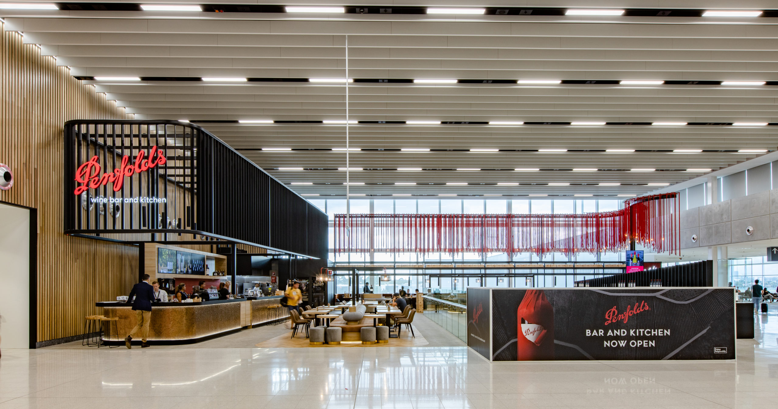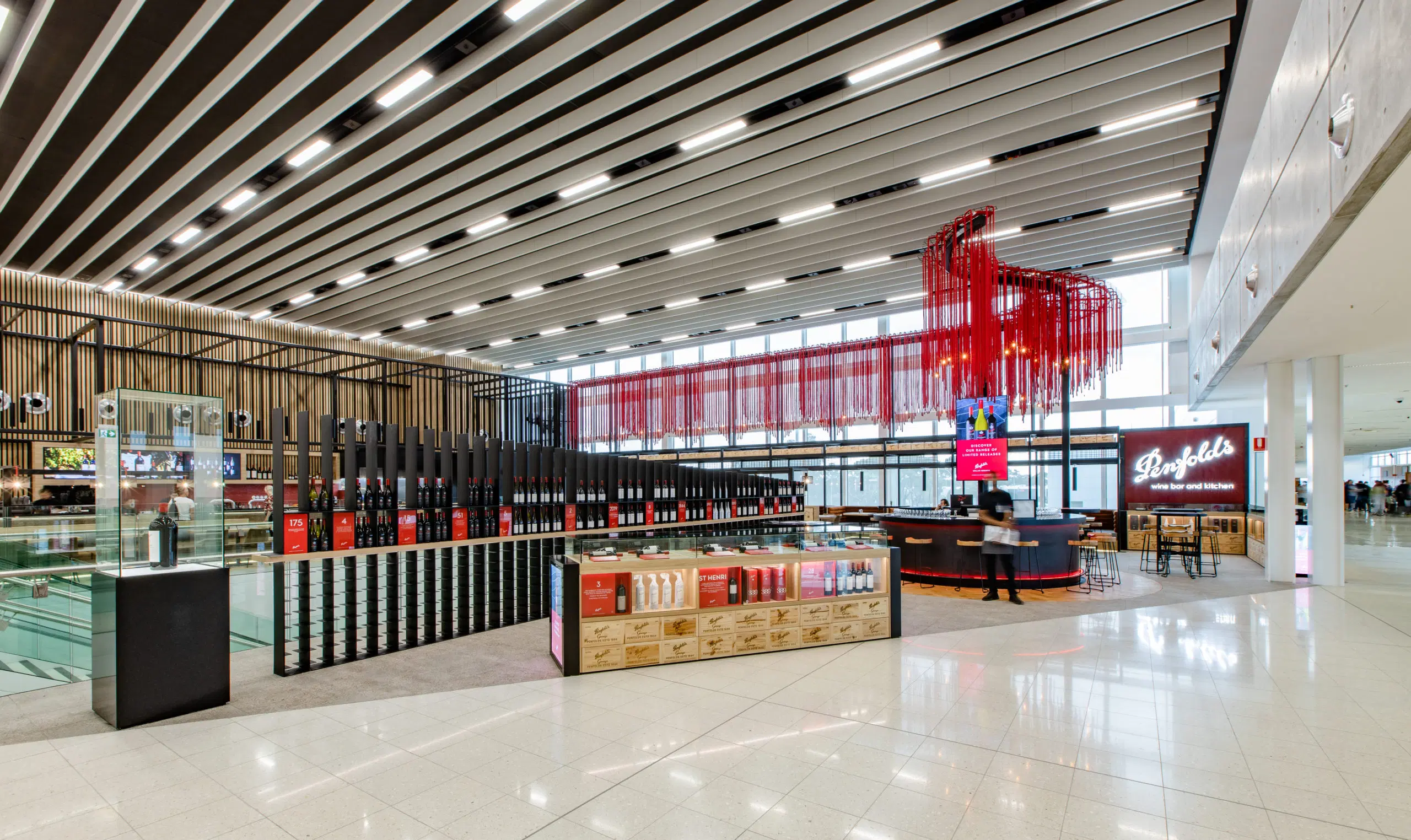 One of the key design features is the bespoke red rope display that runs from the black louvered canopy along the rear to the tenancy. The rope installation creates a seamless undulating flow right through the high ceiling dropping down to the tasting bar.