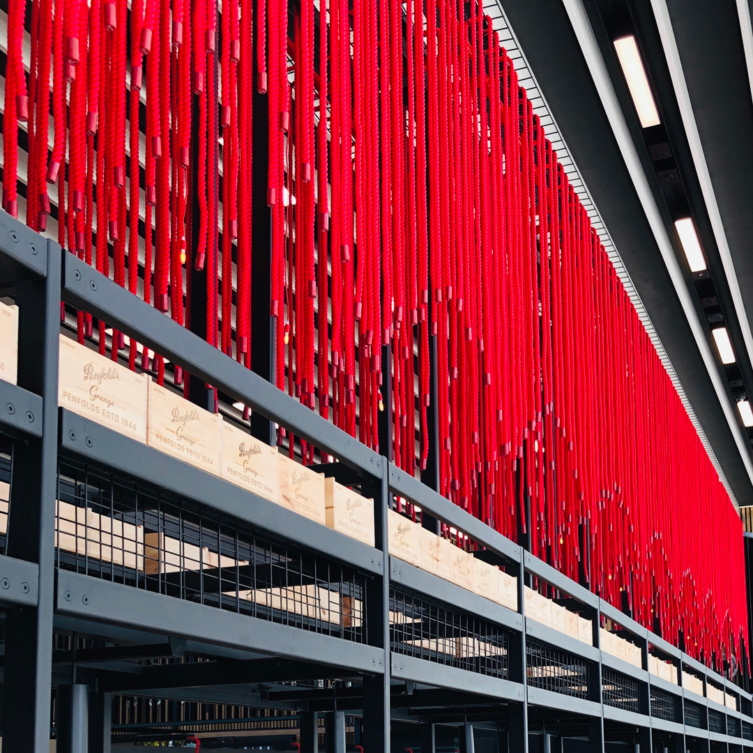 This installation evokes the movement of red wine flowing from bottle to glass. Each rope length is finished with a Penfolds wine cap on the base, providing an element of brand surprise to the customers as they look up.